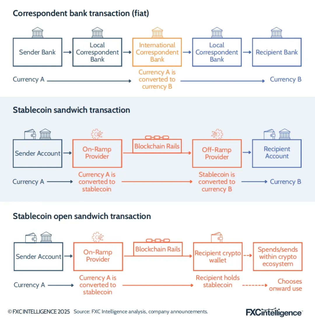 尽管细节上存在差异,目前稳定币跨境支付的常规做法通常被称为 “稳定币三明治”(stablecoin sandwich)。这一术语最早由 Fireblocks 支付与网络高级副总裁 Ran Goldi 于 2021 年提出。