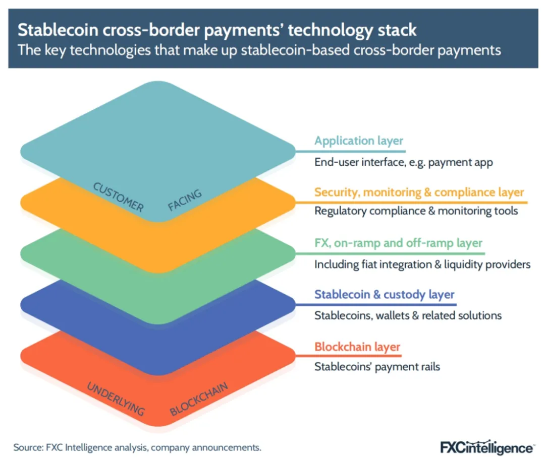 在真实支付流程里,稳定币只是整个技术栈中的一层,可以把整套架构想象成一块 “三明治”——稳定币被夹在中间,上下各有多层能力共同完成跨境价值转移。
