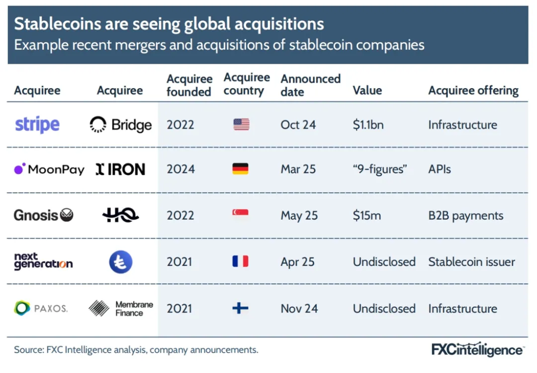 与此同时,一系列并购也在加速:传统巨头希望通过收购迅速补齐自身在该领域的能力。尽管动作频繁,Stripe 于 2024 年宣布、2025 年初完成的稳定币基础设施公司 Bridge 收购案,仍被普遍视为整个行业 “认真对待这项技术” 的催化剂。