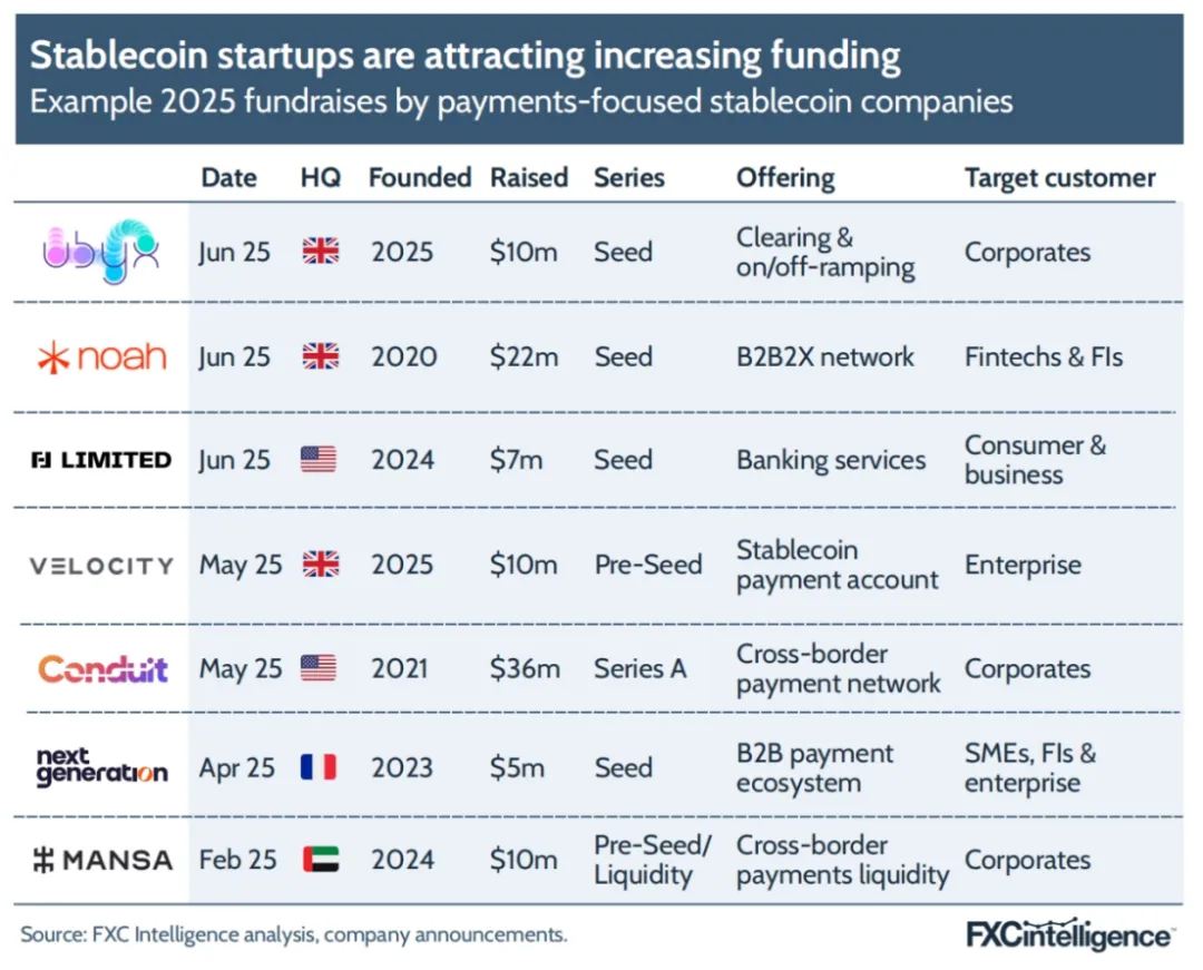 除了老牌企业兴趣高涨,资本也持续加码。尽管整体创投环境趋冷,但稳定币赛道仍吸金不断,过去一年大批项目官宣融资。