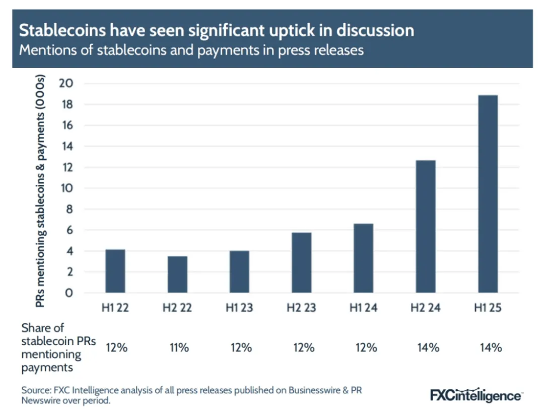 如今,尽管稳定币在市场中所占份额很小,但其关注度却明显上升。2025 年上半年,有关稳定币和支付的新闻稿数量较上年同期增长了 186%,这一增长速度超过了此前稳定币整体新闻稿的增长速度,而涉及跨境支付和稳定币的新闻稿数量更是猛增了 1000% 以上。而且这只是公开推出稳定币解决方案的公司。