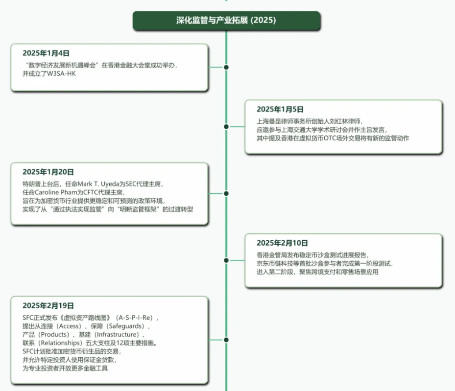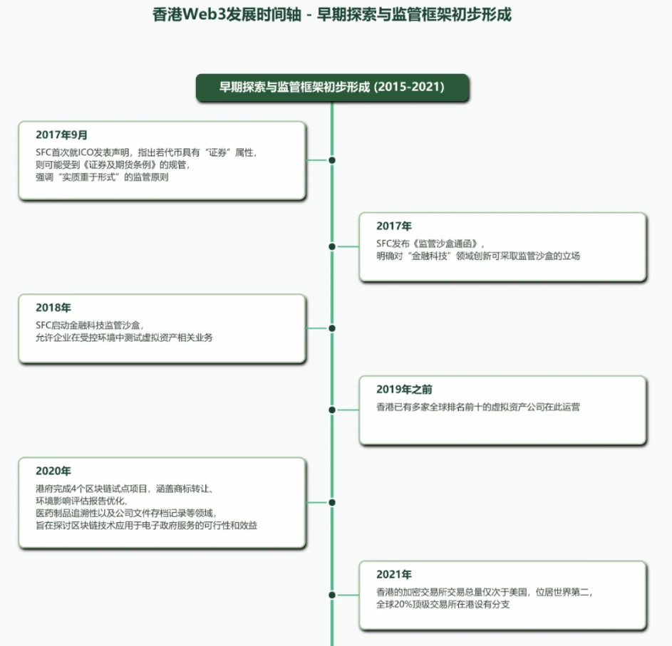 在内地实施严格监管的同时,香港的角色则更为审慎和微妙,它既是避免风险外溢的 “防火墙”,也悄然成为了观察全球 Web3 发展的 “观察哨”。为了在保障投资者利益的同时鼓励金融科技创新,香港金管局于 2016 年 9 月率先推出了 “金融科技监管沙盒”,随后 SFC 和保险业监管局(HKIA)也分别推出了各自的沙盒,并在 2017 年升级为 “沙盒 2.0” 实现跨界别协调运作。而在同年 9 月,香港证券及期货事务监察委员会(SFC)就首次就 ICO 发表声明,指出若代币具有 “证券” 属性,则可能受到《证券及期货条例》的规管,强调 “实质重于形式” 的监管原则。此后,SFC 持续关注虚拟资产基金经理和交易平台的运作,并于 2018 年启动了金融科技监管沙盒,允许企业在受控环境中测试其金融科技创新项目,包括与虚拟资产相关的业务。