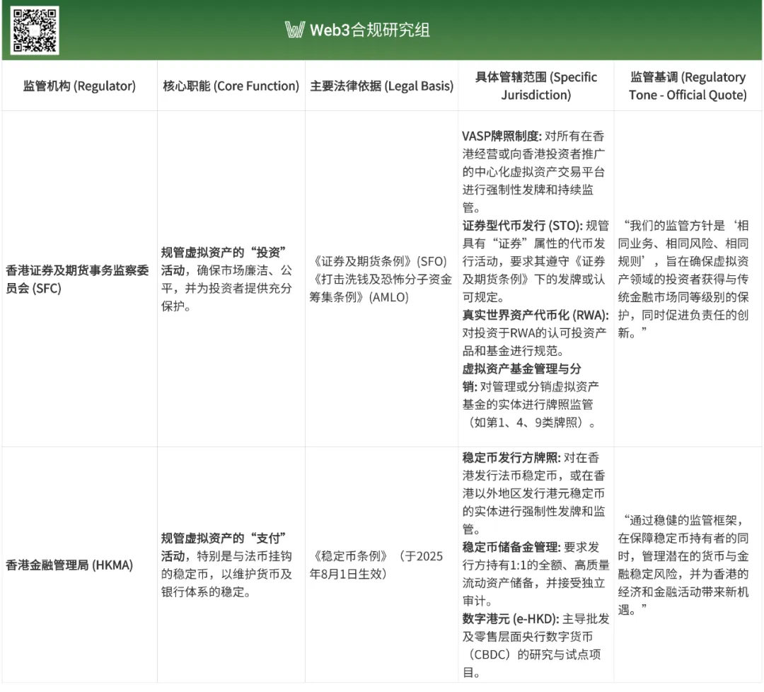 香港 SFC 与 HKMA 通过明确的职能划分与紧密的合作(如签署谅解备忘录),形成了一个协同互补的监管格局。SFC 作为证券市场的守护者,将成熟的投资者保护原则延伸至虚拟资产投资领域;而 HKMA 作为金融体系的中枢,则确保支付型代币的创新不会动摇香港的货币根基。这种双峰并立、权责清晰的模式,共同构成了香港发展成为全球领先虚拟资产中心的坚实制度保障。
