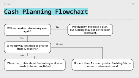 核心思路是,如果资金储备能维持 12 个月以上,那么本年度的计划中可能不包含融资。或许你的优先事项是打造产品或组建团队。但如果资金储备不足 12 个月,运营计划就应该包含融资、削减成本、寻找战略合作伙伴和投资机会,或者以上所有内容。你可能还需要认真审视支出,寻找改进的方法。