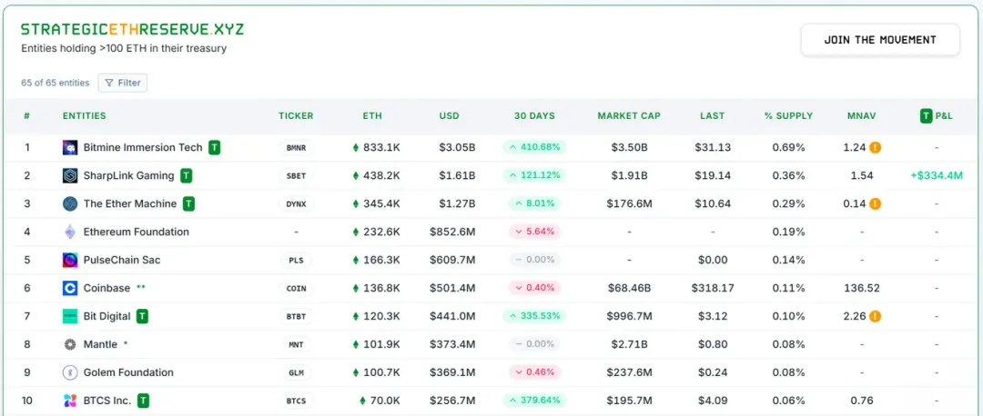 据官方报道显示,7 月 21 日值 ETHM 宣布上市时,BitMine 和 SharpLink 的 ETH 储备分别仅为 30 万和 28 万枚,均低于 ETHM 计划的 40 万枚初始规模。然而到 8 月 5 日,BitMine 的持仓量已飙升至 83.3 万枚(市值 30 亿美元),其增幅高达 177%,一举夺得头筹;SharpLink 也不甘示弱,据 Nansen 链上数据,其储备量已达 49.8 万枚(市值 18 亿美元),增幅 78%,位列第二,并公开宣布要冲击 100 万枚目标。就连前比特币矿工 Bit Digital 也紧急转向,积累了 12 万枚 ETH。