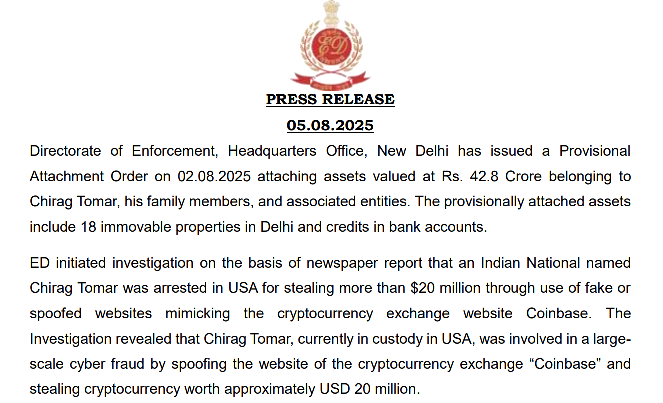 - 印度当局冻结涉及 Coinbase 用户加密诈骗案的 480 万美元