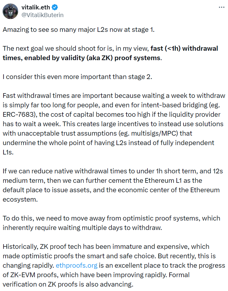 - Vitalik:L2 下阶段目标应为通过 ZK 系统实现快速提现