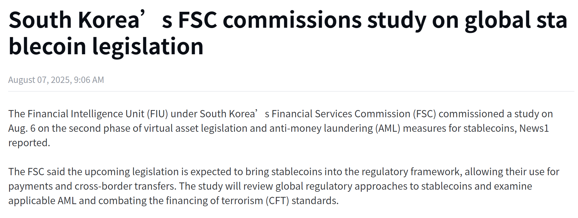- 韩国金融监督管理委员会委托研究全球稳定币立法