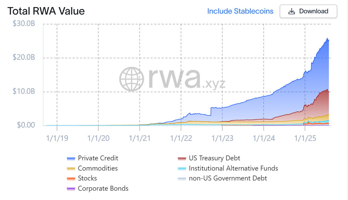 作为一个专注于真实世界资产(RWA)代币化的加密金融项目,Ondo Finance 自 2021 年主网上线以来,已经成为该领域的重要参与者。根据 rwa.xyz 数据显示,全球 RWA 市场的规模已突破 250 亿美元,且在 2024 年之后,市场增速显著加快。作为连接传统金融与区块链技术的桥梁,RWA 正在成为加密经济中的核心赛道之一。