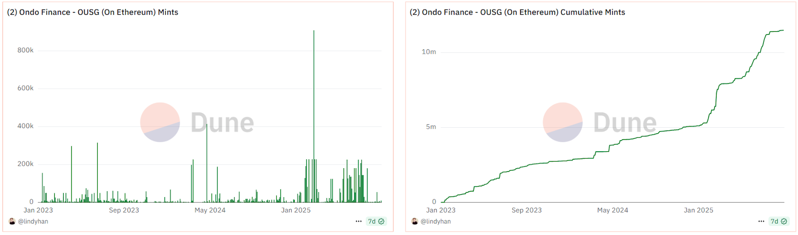 自 2025 年 1 月开始,Ondo Finance 上的资产铸造频率更加密集,助推其链上 OUSG 规模实现新高。