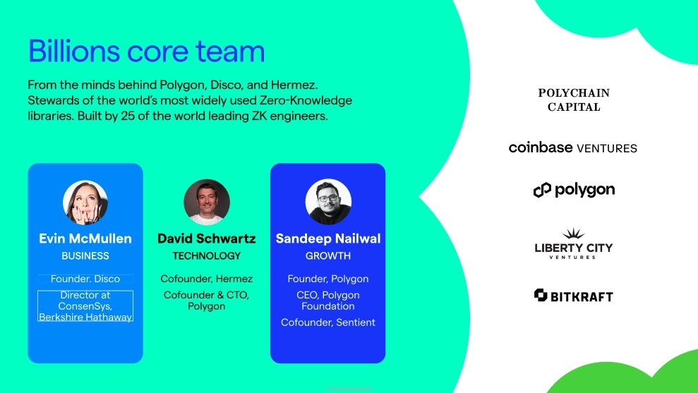 因此,Billions 的核心团队与 Polygon 有着密不可分的关系,不少员工都有在 Polygon 工作的经历——其联合创始人 David Z 同时也是 Polygon 的创始人之一,曾任 Polygon 的首席技术官,并担任 Polygon ID、Polygon zkEVM 的项目负责人。此外,他也是基于以太坊的去中心化、零知识证明(ZKP)身份管理框架 Iden3 协议的项目负责人。