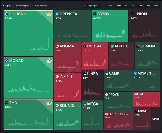 就在消息公布后不久,Kaito 旗下 Web3 众筹平台 CapitalLaunchpad 宣布,计划于 8 月 6 日上线 Billions Network。根据 Kaito 实时监测数据,Billions 在近期链上活动中占比高达 8.03%,居其排行榜首位。脱胎于 Polygon ID 的 Billions,经过在去中心化身份这个赛道上持续深耕,已经又做出了些新 “名堂”。