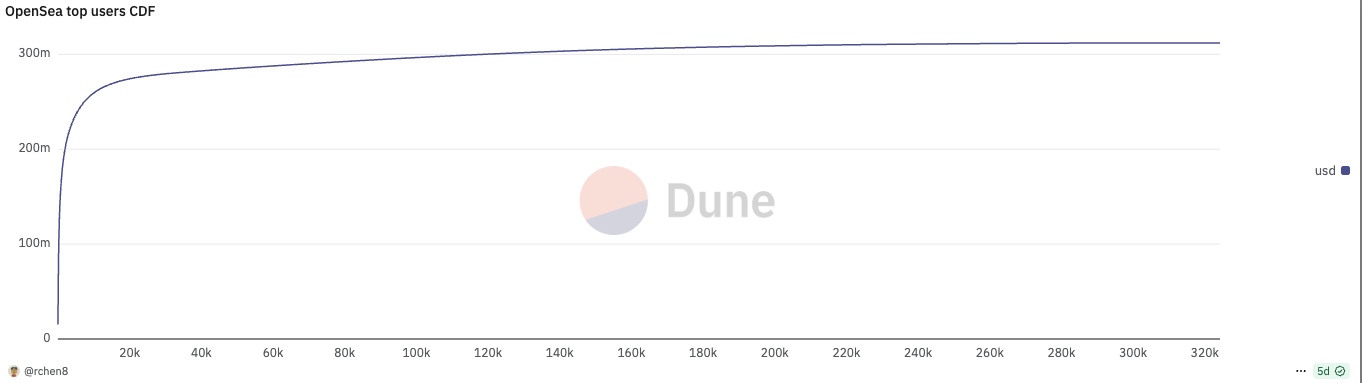 每一款成功的加密原生产品,其用户使用情况都呈现出极端的幂律分布。上个月,排名前 737 位的用户(占比总用户 0.2%)的交易量占 OpenSea 交易量 的一半;排名前 196 位的用户(占比总用户 0.06%)的交易量占 Polymarket 交易量 的一半。