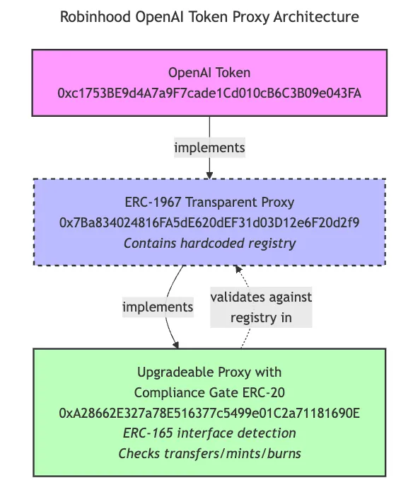 在 Robinhood 部署代币后,Electric Capital 的研究员 @0xren_cf 通过反编译合约的字节码获得了这些代币合约的控制流,如下图所示。代币的每次转账都需要检查目标地址是否在注册表中,以确保满足AML/CFT等合规要求:
