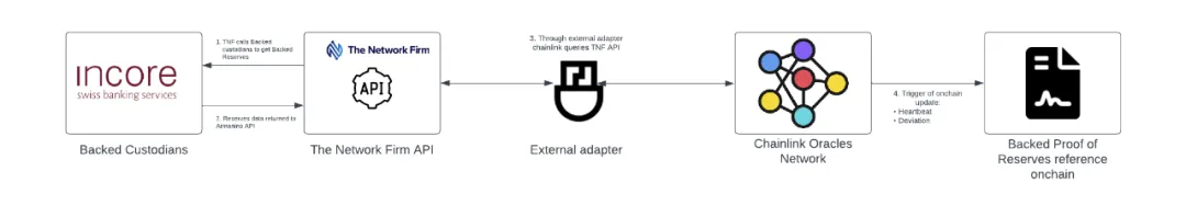 The Network Firm 通过银行 API 端点完全访问 Backed Finance 的托管账户,并可以独立检查其储备的状态。这些信息通过外部适配器传递到 Chainlink。Chainlink 的多个节点读取审计员传递的值,并将其传播到链上,供所有人公开访问。