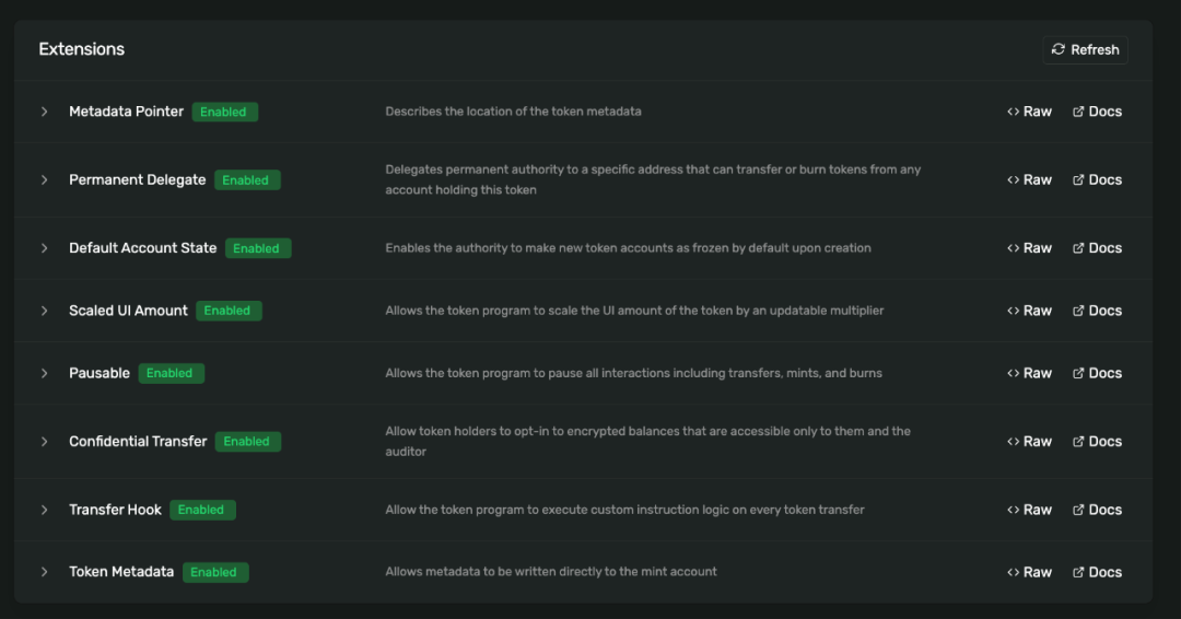 xStocks 由 Backed Finance 推出,是基于 Solana进行股票代币化(SPL 代币标准+代币拓展)的币股交易平台。xStocks 发行的代币化股票实现了Permanent Delegate、Pausable、Confidential Transfer等多个代币拓展功能,代币的特权地址可对流通的代币进行销毁、冻结等操作,以满足特定的监管场景。