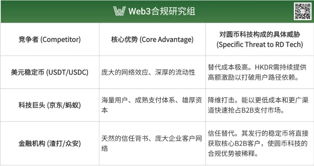 - 新晋巨头的降维打击:真正的生存威胁来自于科技巨头(如京东、蚂蚁)与传统金融机构(如渣打银行)的入局。前者拥有海量用户、成熟支付网络和雄厚资本,能以补贴战和场景捆绑的方式,迅速抢占市场份额。后者则手握天然的信任背书和庞大的企业客户资源,一旦其发行的稳定币问世,将轻易获取对合规性要求最高的 B2B 客户,使圆币科技的 “合规” 优势不再独特。