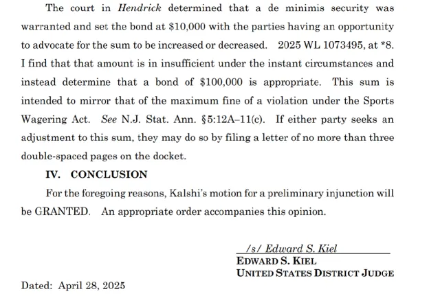 就此,Kalshi 已经与新泽西州等地的赌博监管机构展开了旷日持久的法律斗争。尽管新泽西联邦地区法院法官 Edward Kiel,认定 Kalshi 提供的体育事件合约属于 CFTC 的专属监管范围,裁决新泽西州监管部门停止干预 Kalshi 的正常运营,但此类争议仍未盖棺定论。这种联邦与州之间的管辖权争议,也将进一步加剧了美国预测市场监管环境的不确定性。