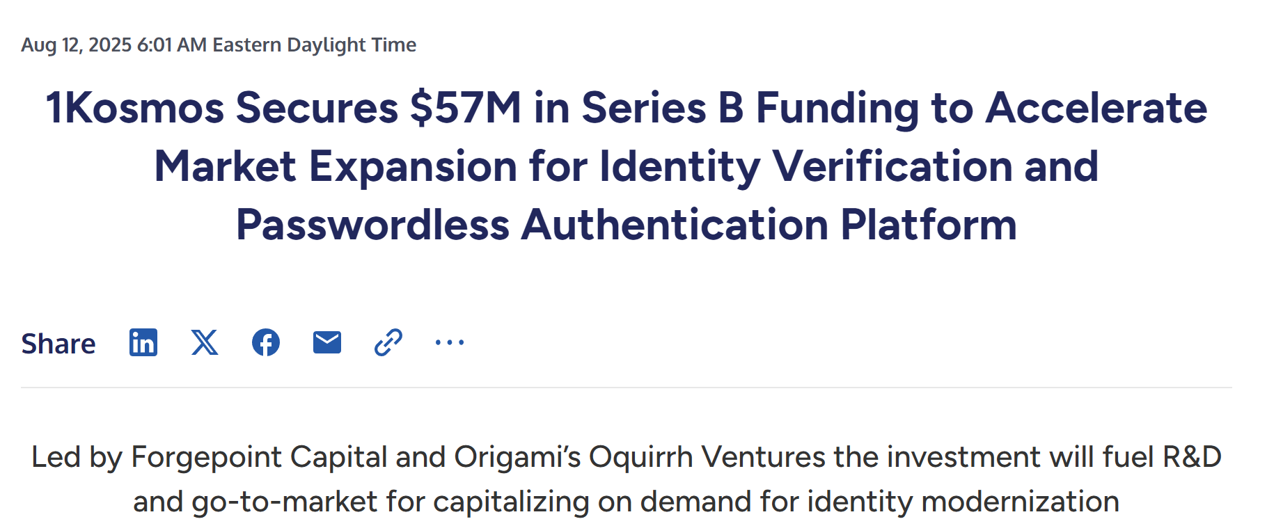 - 区块链身份验证平台 1Kosmos 完成 5700 万美元 B 轮融资