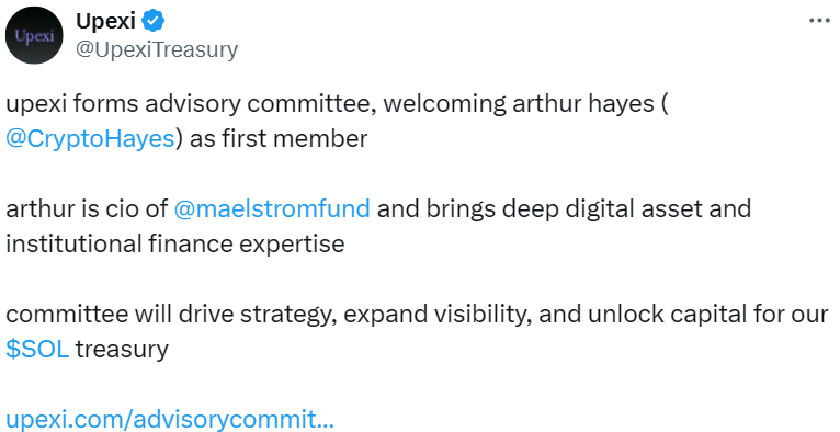 - Solana 财库公司 Upexi 宣布 Arthur Hayes 加入其顾问委员会