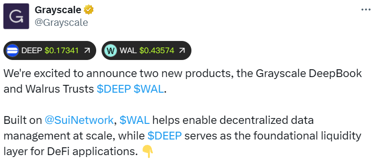 - 灰度推出 DeepBook 和 Walrus 信托产品