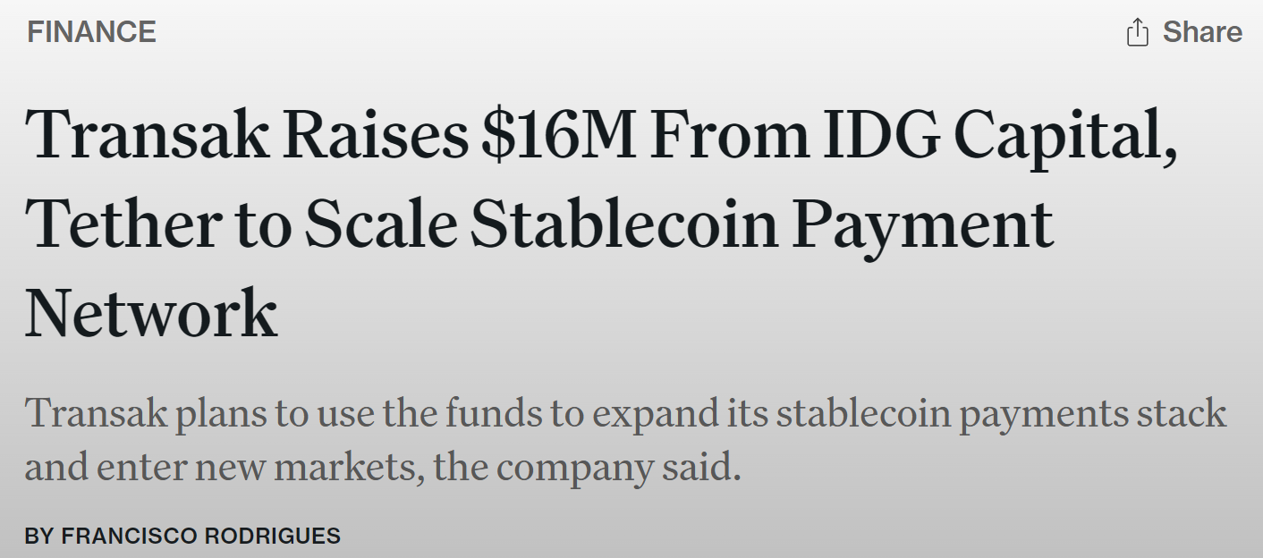 - Web 3 支付基础设施公司 Transak 宣布完成 1600 万美元新一轮融资,由 IDG Capital 和 Tether 共同领投