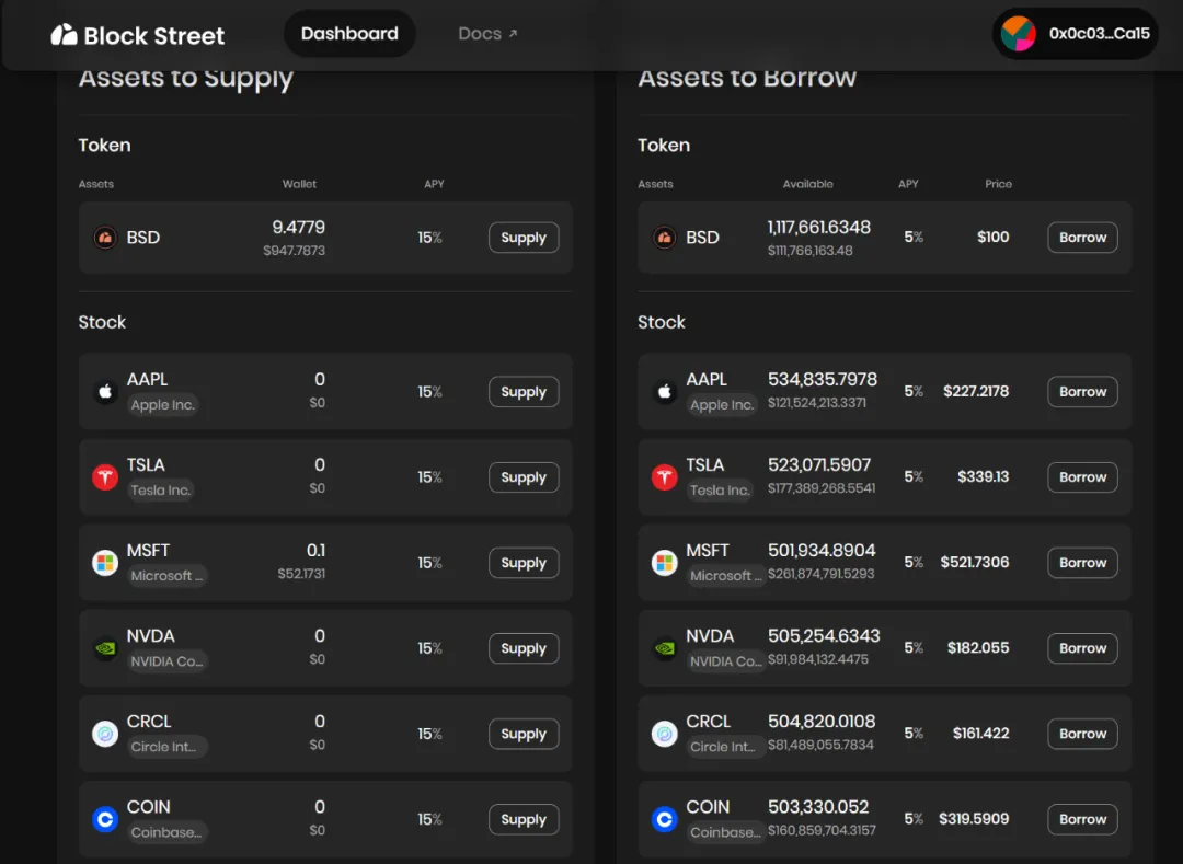 Block Street 作为目前少数专注于代币化股票借贷的 DeFi 协议,则将视线瞄准了更下游、也更具潜在爆发力的流动性释放方向。