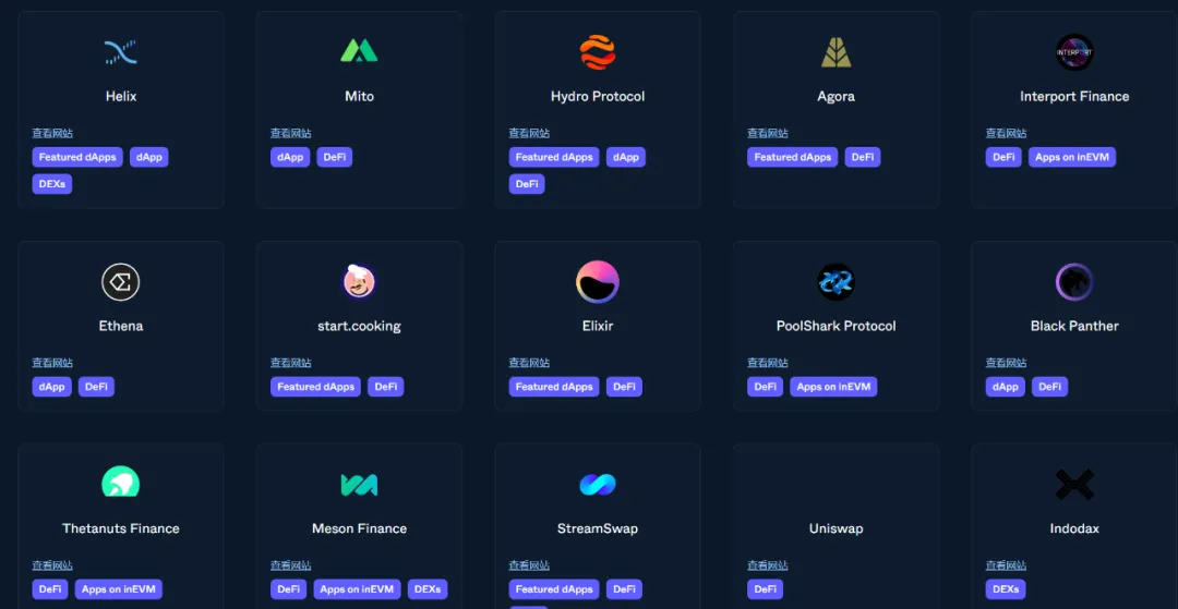 截至目前,Injective 生态已聚合超过 200 个项目,涵盖去中心化交易所(Helix、DojoSwap)、链上借贷(Neptune)、RWA 平台(Ondo、Mountain Protocol)、NFT 市场(Talis、Dagora)等多个领域。