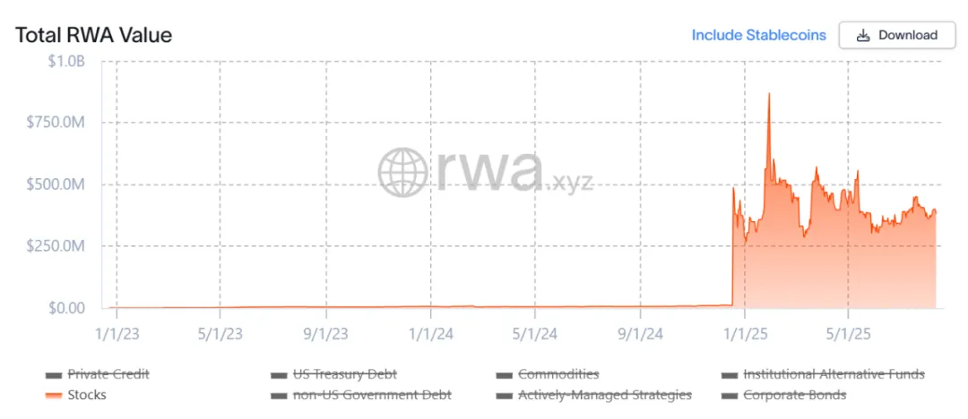 rwa.xyz 数据显示,今年以来,股票类代币化资产的规模已从几乎为零跃升至数亿美元,背后则是股票代币化正从概念加速走向落地——经历了从合成资产到实股托管的模式演进,并正向衍生品等更高阶形态延伸。