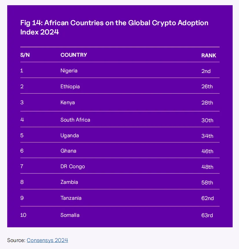 尽管撒哈拉以南非洲(SSA)仅有 4.8 万亿美元加密交易额,占全球交易额的 2.7%(相较于 中东和北非 MENA 地区的 7.5%),但是当地企业已将加密货币用于日常支付、抵御通胀,以及进行更加频繁、金额更小(零售级)的转账。根据 Chainanalytics《2024 全球加密货币地理报告》,稳定币已经占据撒哈拉以南非洲(SSA)43% 的交易量,尼日利亚的加密采用率位居全球第二(仅次于印度),埃塞俄比亚(第 26 位)、肯尼亚(第 28 位)和南非(第 30 位)也跻身前 30。