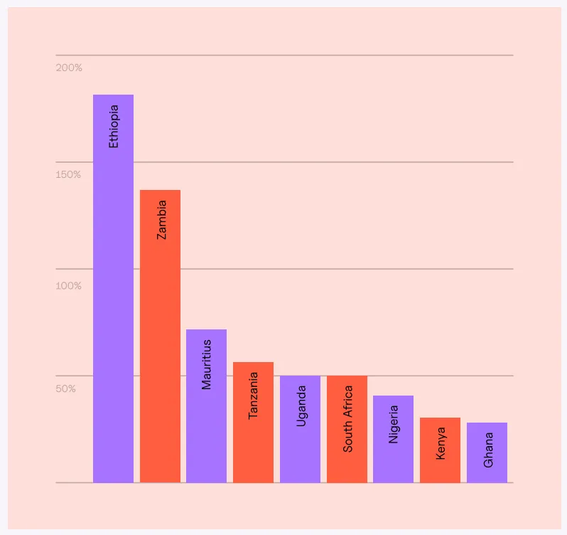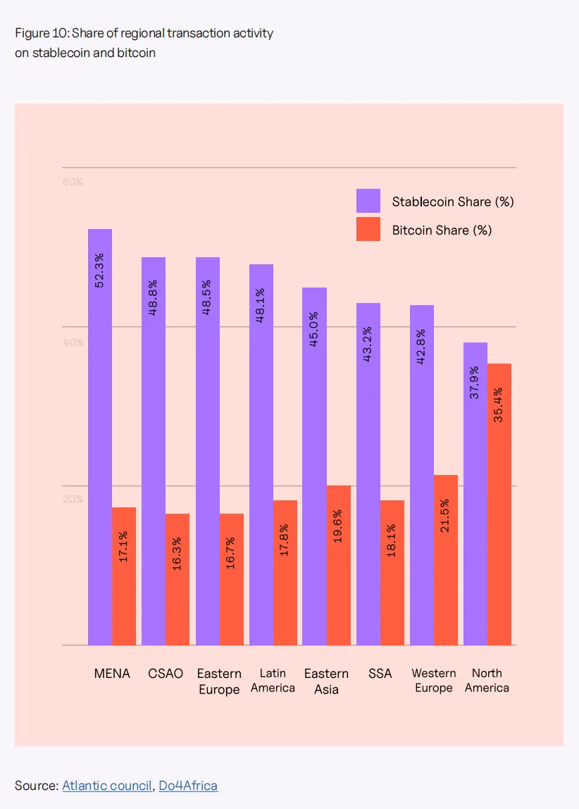 稳定币已成为结算的主导资产,占撒哈拉以南非洲(SSA)全部加密交易的 43%,凭借价格稳定、实时结算、透明审计等特性广受青睐。仅尼日利亚就吸纳了 SSA 稳定币流入量的 40% 以上,埃塞俄比亚和赞比亚年增速均超 100%。企业正使用 USDT、USDC 等稳定币对冲外汇波动、简化进口流程、加速跨境结算,稳定币交易量已在多数非洲地区超越比特币。