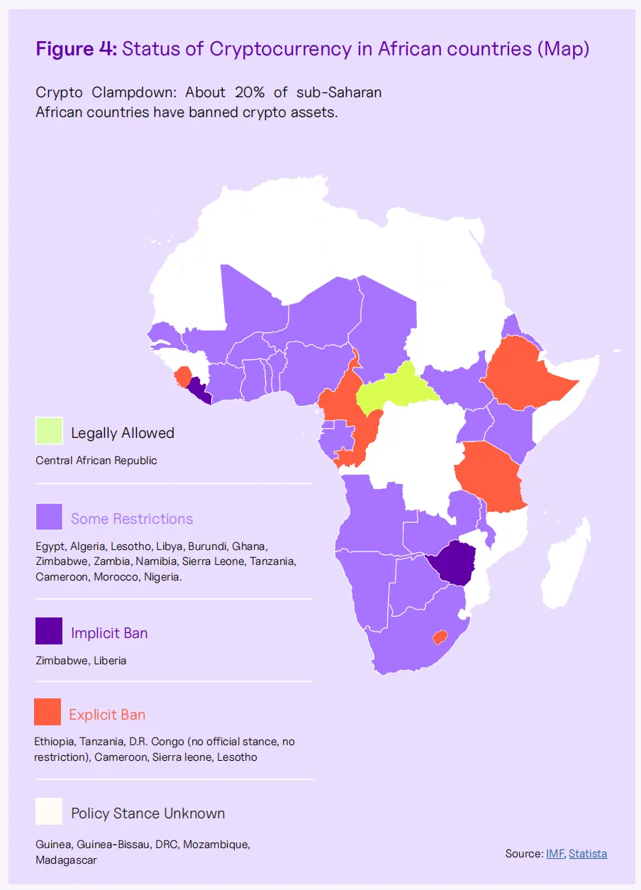 - 监管不确定性:许多非洲国家尚无允许加密货币的法规。尽管尼日利亚、肯尼亚、南非等国正围绕虚拟资产服务商(VASP)制定战略,但最终走向仍不明朗。加密资产仍被视为对货币政策机构的潜在威胁。