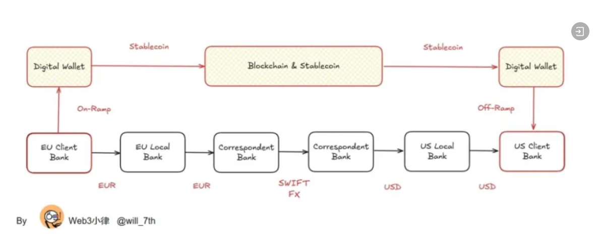 就在我们此前文章《稳定币支付与全球资金流转模式》中探讨的,虽然稳定币将区块链 “即时转移资金与价值” 的核心能力体现得淋漓尽致,然而,支付远不止于 “点对点转账” 这一环节。就像稳定币三明治中,虽然用区块链替代传统支付通道的横向价值/资金传输,但是上下两端仍依赖老旧金融支付体系,依旧是要回到目标国市场的银行金融账户体系。