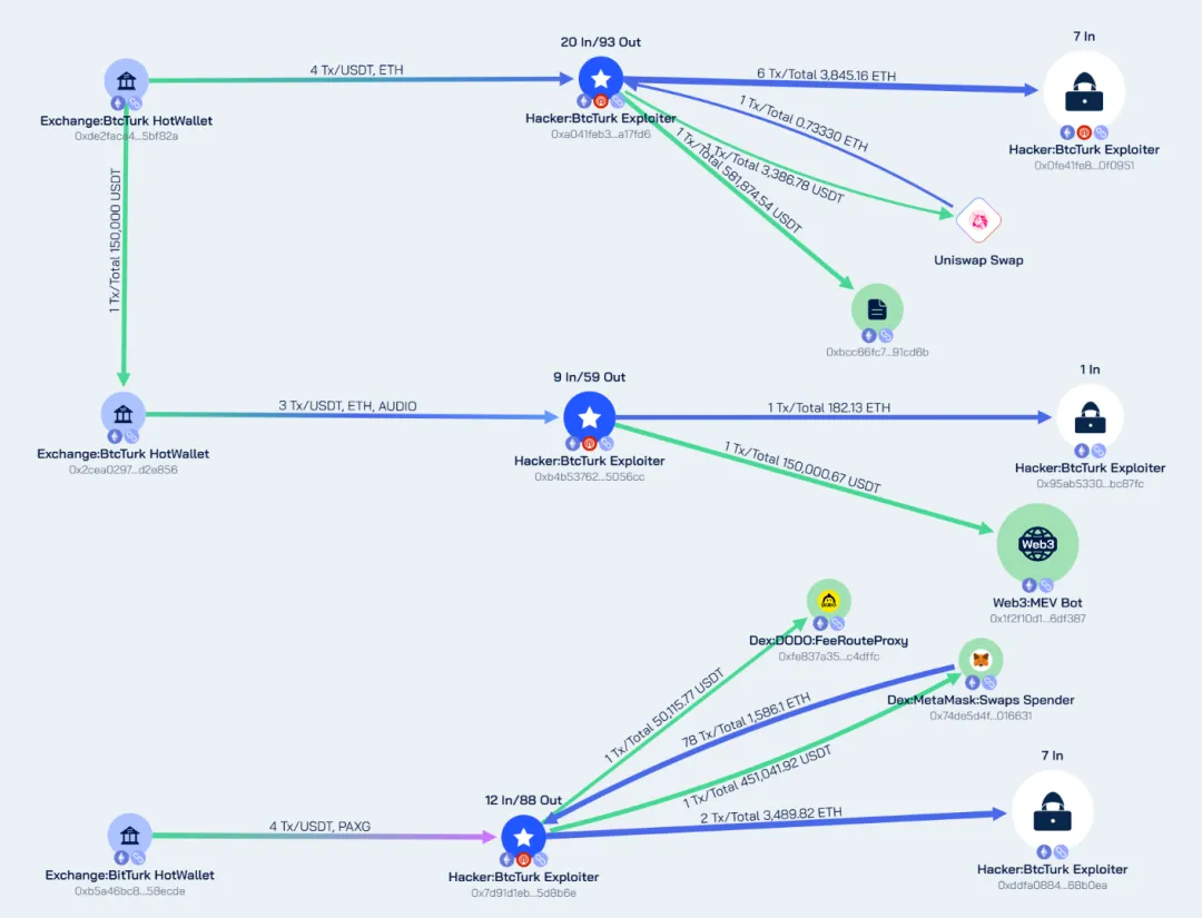 近日,加密货币交易所 BTCTurk 发布公告确认被黑客攻击,多个链上热钱包异常流出资金超 4800 万美元。Beosin 安全团队对该事件进行了分析和资金追踪,并将结果分享如下:
