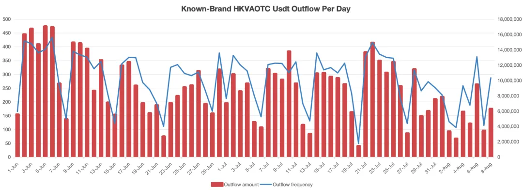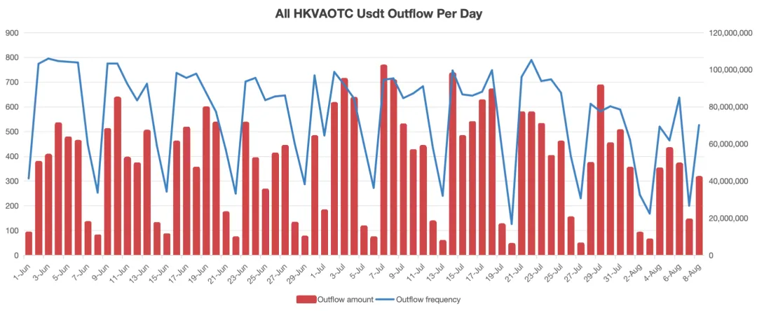 6 月 1 日至 7 月 31 日之间,全部业务地址共转出 3.17B USDT,日均 52.04M USDT;8 月 1 日至 8 月 8 日之间,全部业务地址共转出 279M USDT,日均 34.90M USDT。