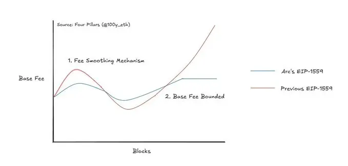 Arc 对 EIP-1559 模型进行了多项改进。首先是引入"手续费平滑机制":该机制采用指数加权移动均值算法,通过综合考量过往及近期区块的手续费数据(较旧数据权重呈指数级递减,近期数据权重递增)来确定后续区块的手续费。传统 EIP-1559 在确定下一区块的基费时仅参考前一区块的使用情况,而 Arc 改进版则通过纳入包含前一区块在内的多个历史区块使用数据,显著平抑了基费的波动性。第二项改进是"基费封顶机制",该机制为基费设置了固定上限,确保即使在 Arc 网络拥堵期间手续费也不会无上限增长。