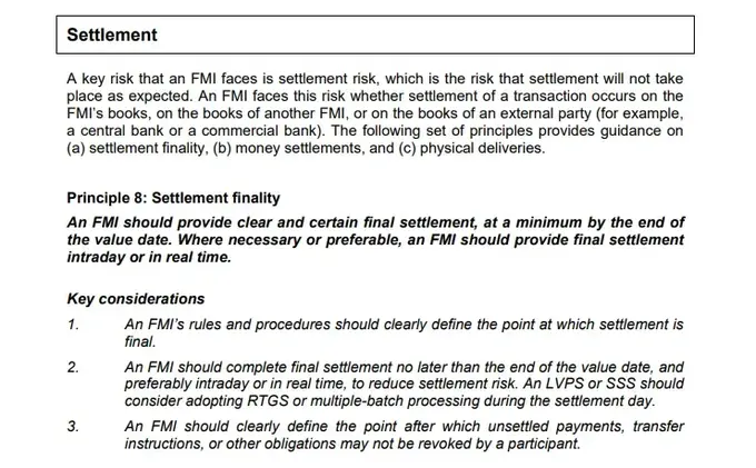 第一处引用强调 Arc 的所有交易都具备即时最终性,这符合国际清算银行在 2012 年发布的《金融市场基础设施原则》中的原则 8:结算最终性。