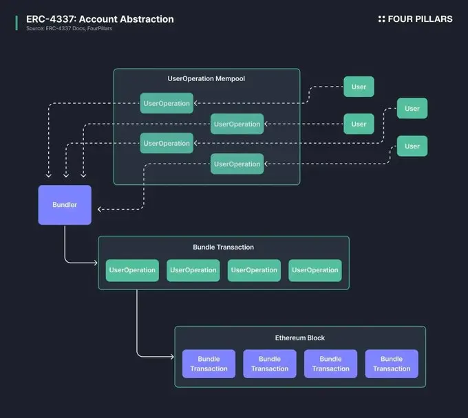 ERC-4337 标准是目前应用最广泛的账户抽象协议,它在不改变以太坊底层协议的前提下,新增了 Entrypoint、Bundler 和 Paymaster 功能模块,大幅降低了账户抽象的实现门槛。在该协议中,用户不再直接签署交易,而是签署名为 UserOp 的独立对象。这些 UserOp 被存储于独立的链下内存池,而非以太坊官方内存池。Bundler 会验证这些 UserOp 并将其打包成单笔捆绑交易,随后发送至名为 Entrypoint 的智能合约。入口合约一次性完成所有 UserOp 的验证执行与 Gas 费结算,此时 Paymaster 模块允许用户使用其他代币支付 Gas 费用。
