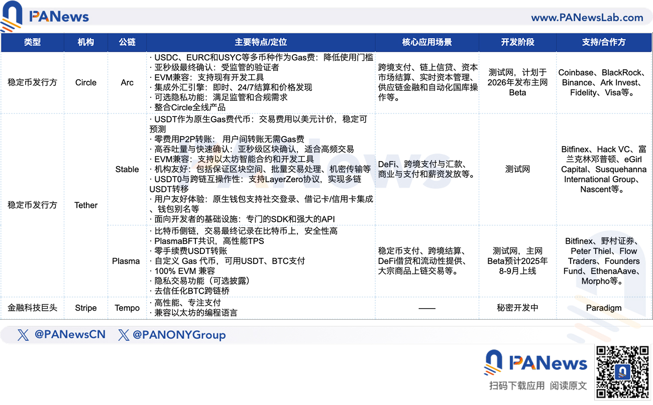 项目进度与资本支持上,Stable 已上线测试网,并完成由 Bitfinex 与 Hack VC 领投的 2800 万美元种子轮融资;Arc 则尚未进入测试网阶段,但 USDC 背后是 Coinbase、BlackRock 等重量级机构的资源与信用背书。