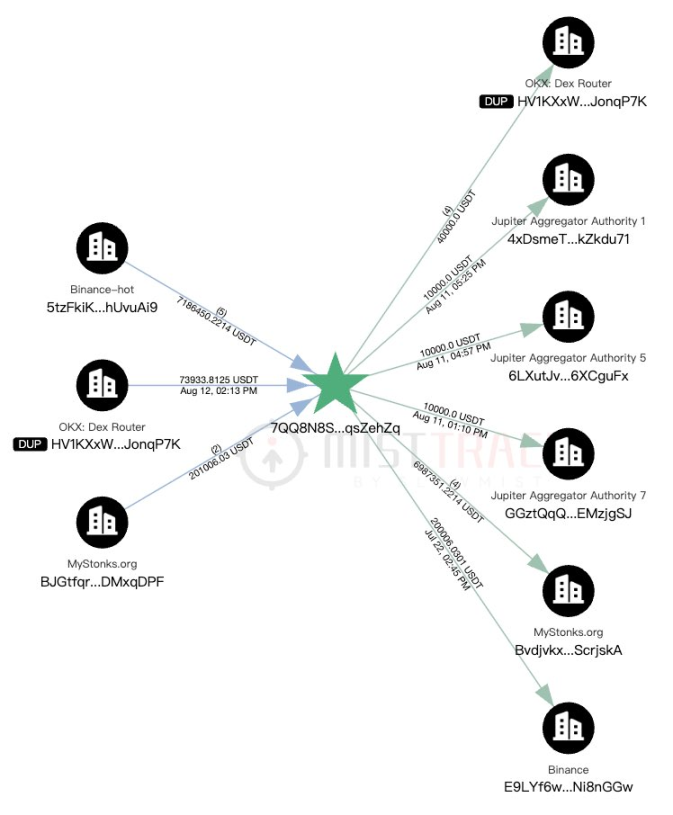 慢雾创始人余弦随后称,初步解析链上资金流向,其中大资金来自于币安提币收到目标用户请求,初步看了下,如图是目标用户在 MyStonks 被冻 620 万刀的来源 USDT 情况,绿色五星图标 7QQ8N8S 是用户自己的 SOL 地址,大资金都来自 Binance 提币,DEX 交互都是 STONKS 和 USDT 兑换有关。