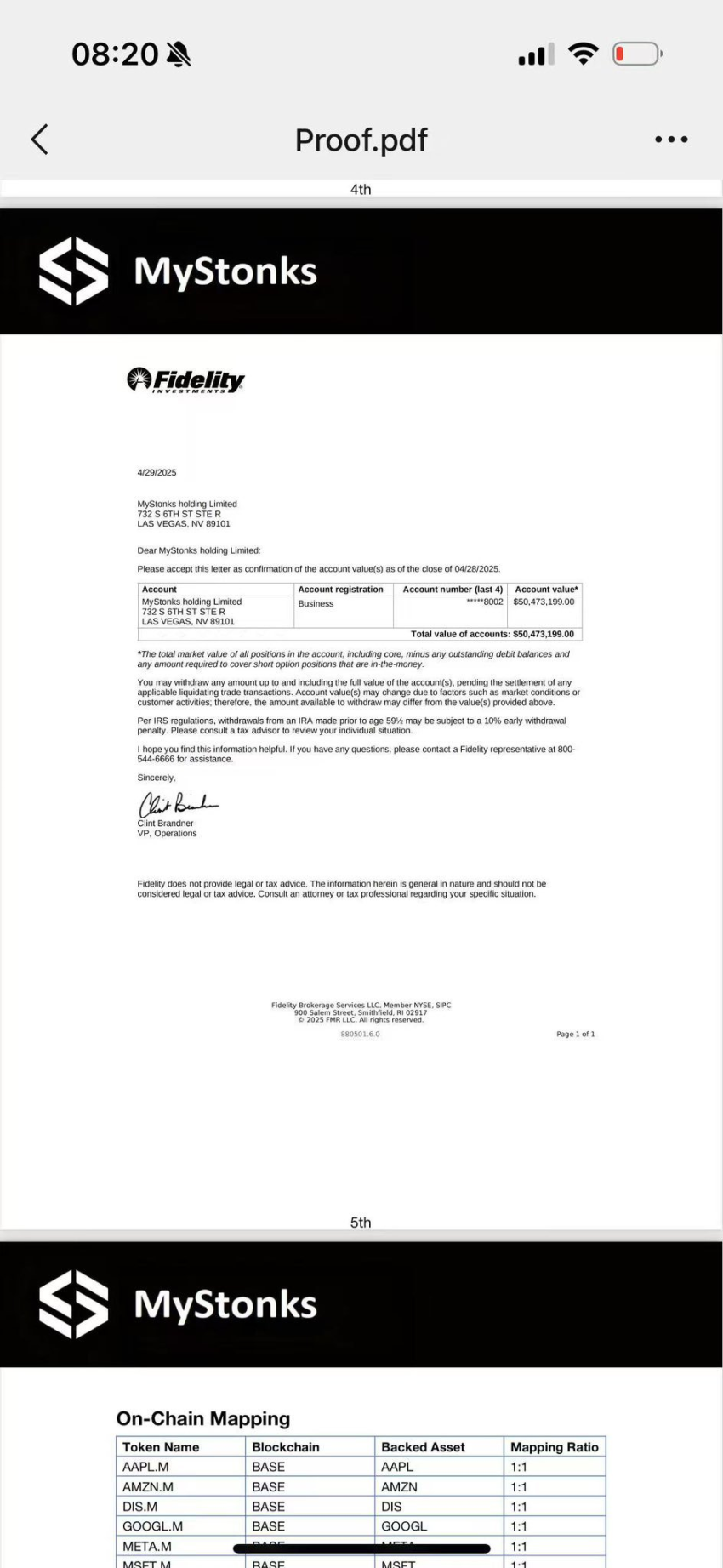 此外,Phyrex 表示某用户提供的「富达托管证明」为 Fidelity Investments 于 2025 年 4 月 29 日出具的账户余额确认信,致 MyStonks holding Limited。信中显示账户总值为 50,473,199 美元,署名为 Clint Brandner(VP, Operations)。但该确认信只是客户向券商索取的余额确认函,并非正式的合作公告或托管协议。