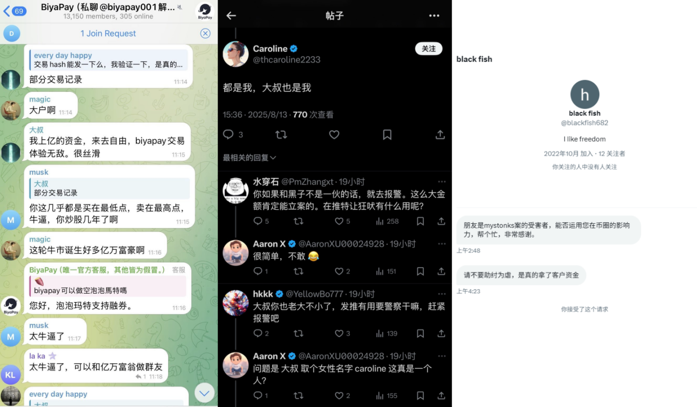 围绕事件的多方叙述中,既有投资人指控,也有竞争对手策划的推测。这些信息均来自第三方社交媒体讨论,缺乏独立证据佐证。Biyapay 官方尚未就相关指控公开回应,涉事用户 @Caroline 亦未正面回复与 Biyapay 关系的质疑。不同版本的故事在社区持续流传,但信息之间仍存在明显缺口,涉事各方的沉默与有限回应,让这起争议的最终走向充满不确定性。