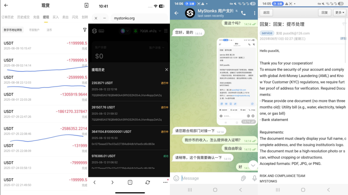 @Caroline 表示,其配合提供了资料,但在平台官方 Telegram 群提到提现问题后被禁言。负责对接的客服多次以笼统说辞回复,之后停止沟通。平台风控部门邮件第一次以材料不合格为由拒绝,第二次提交后超过 12 小时未回复。她尝试在平台后台给管理层留言,但未获回应。