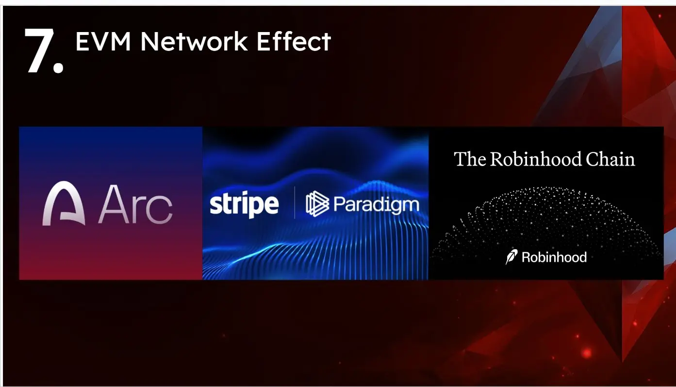 一切始于 Robinhood 链,这是 TradFi 公司构建并拥有 EVM 实例的首个案例。Robinhood 已聘请 EVM 开发人员,而对 EVM 的理解如今已成为 Robinhood 业务的核心。现在,Circle 和 Stripe 也加入了 TradFi 的行列,这些公司已在其公司架构中聘用并管理 EVM 人才。