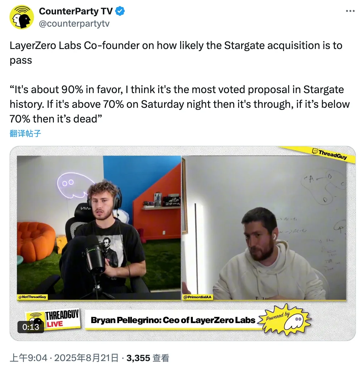 投票启动后,不但快速突破了最低票数要求,支持率更是一度上冲至 97% 以上(根据规则,结束时超过 70% 即通过)。LayerZero 联合创始人 Bryan Pellegrino 在参与 CounterParty 的播客时甚至还骄傲地大谈:“这是 Stargate 历史上参与票数最多的投票。”