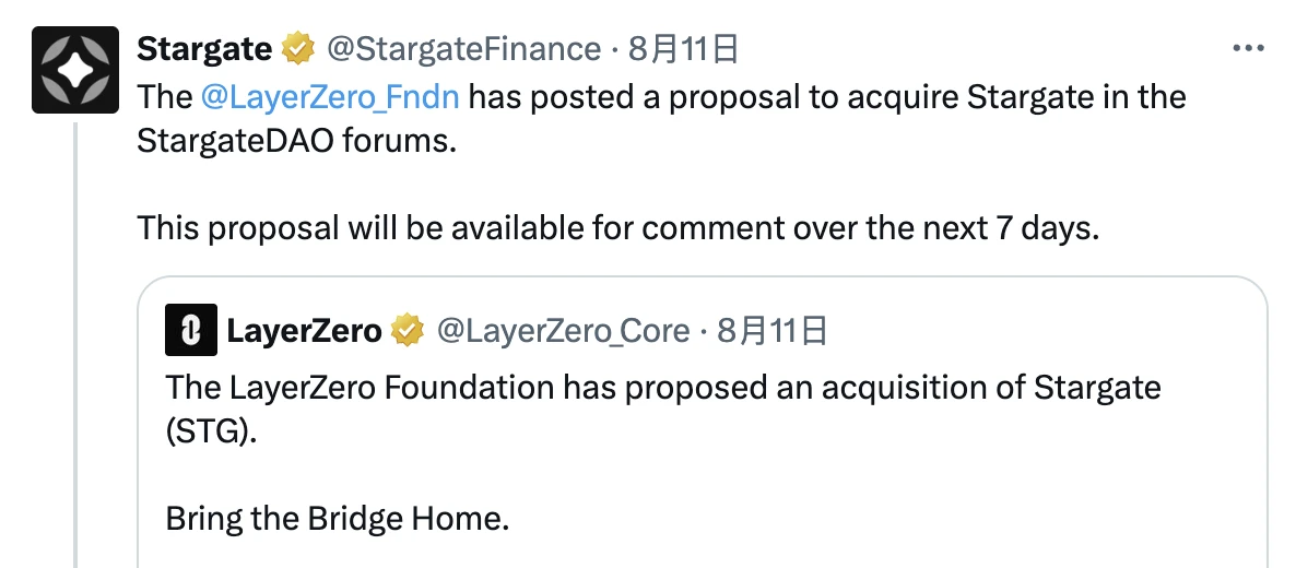 关于 LayerZero 对 Stargate 的收购提案,可追溯至 8 月 11 日 —— 参考阅读《LayerZero 提议收购 Stargate:代币双双暴涨 20%+,但这一群体却强烈反对》。