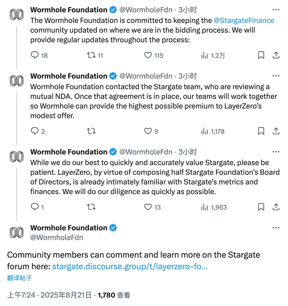 8 月 21 日,LayerZero 的直接竞争对手 Wormhole 基金会于 X 公开宣布,LdayerZero 对 Stargate 提出的约 1.1 亿美元收购报价低估了 Stargate 的协议资产及增长,因此 Wormhole 计划提交更高报价,并请求暂停当前 Snapshot 投票 5 个工作日,以便完善竞标流程,保障 STG 持有者利益。