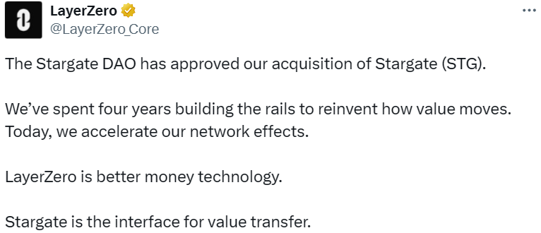 - LayerZero 斥资 1.1 亿美元收购 Stargate 提案获通过
