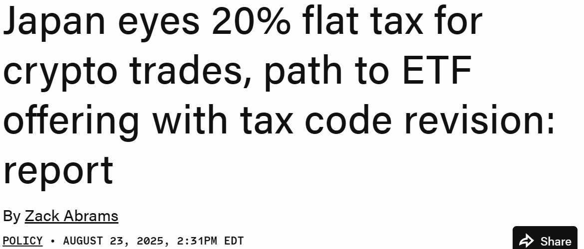 - 日本计划对加密货币交易征收 20% 统一税