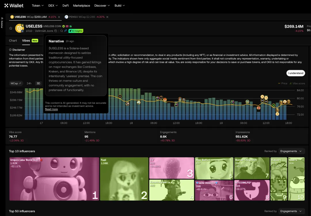 OKX DEX 在产品上将 Vibes 分析与行情并列展示,聚合 KOL 喊单时间点、头部关联 KOL、Narrative Summary 与综合打分,缩短链下信息检索时间。Narrative Summary 已然成为用户反响最好的 AI 产品功能。